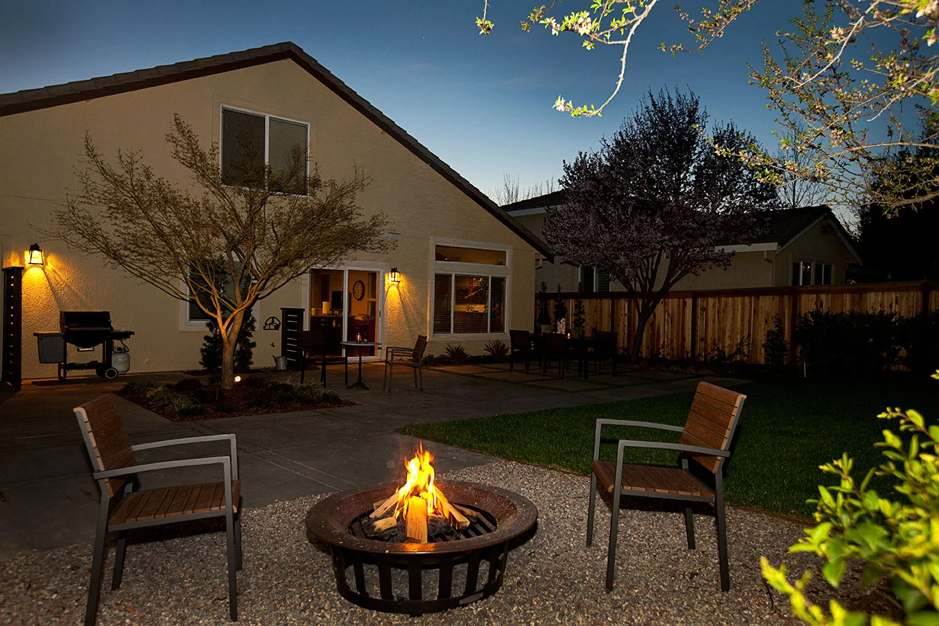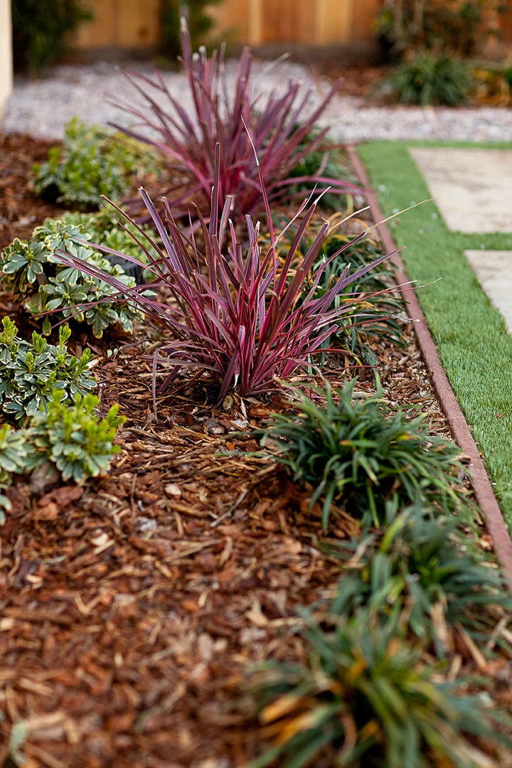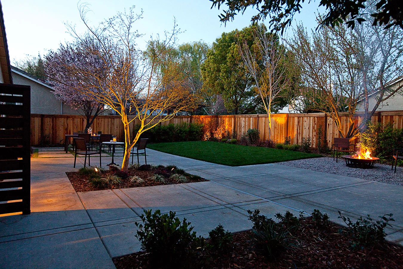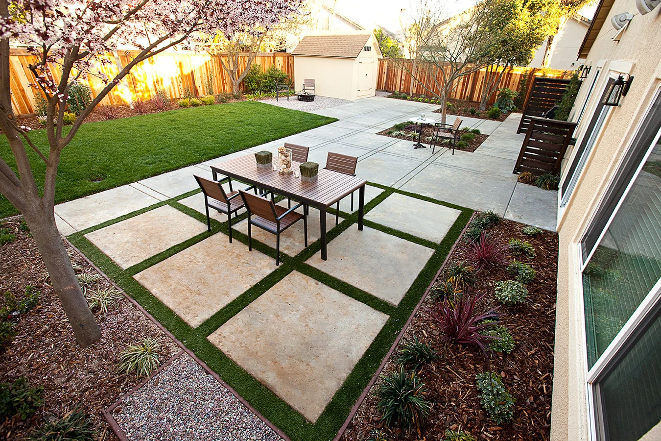 Four months post-construction, this front and rear garden is starting to wake up from its winter nap to get ready for all the entertaining and family gatherings hosted by the client. Design objectives for this project included a low-maintenance and semi-drought tolerant plant palette, space for the family's impromptu croquet and table tennis matches, LED lighting throughout the gardens for evening enjoyment, and a fresh, modern aesthetic to match the newly renovated interiors. Special amenities include an artificial grass grid as a soft dining space definer and custom designed wood panels for use as a master bedroom privacy screen and a plate holder for the BBQ. Modern furniture, a copper fire pit, custom storage shed, and new house paint colors were incorporated as part of the landscape design.