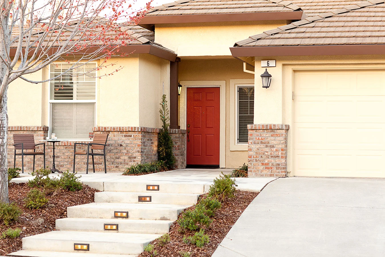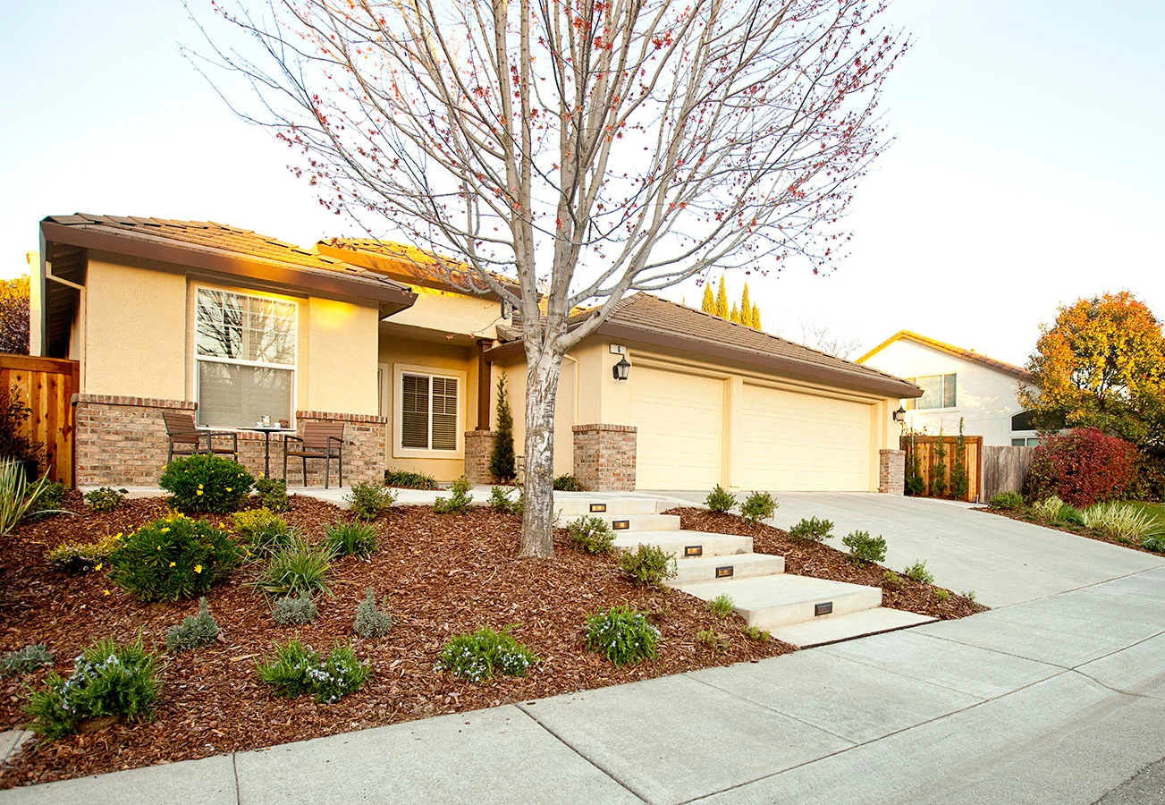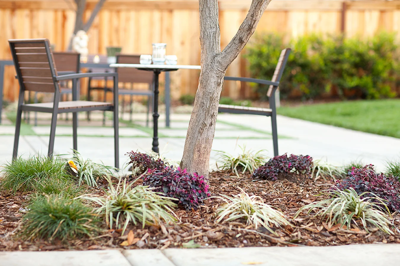 Four months post-construction, this front and rear garden is starting to wake up from its winter nap to get ready for all the entertaining and family gatherings hosted by the client. Design objectives for this project included a low-maintenance and semi-drought tolerant plant palette, space for the family's impromptu croquet and table tennis matches, LED lighting throughout the gardens for evening enjoyment, and a fresh, modern aesthetic to match the newly renovated interiors. Special amenities include an artificial grass grid as a soft dining space definer and custom designed wood panels for use as a master bedroom privacy screen and a plate holder for the BBQ. Modern furniture, a copper fire pit, custom storage shed, and new house paint colors were incorporated as part of the landscape design.