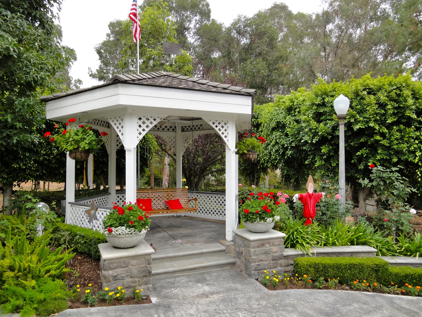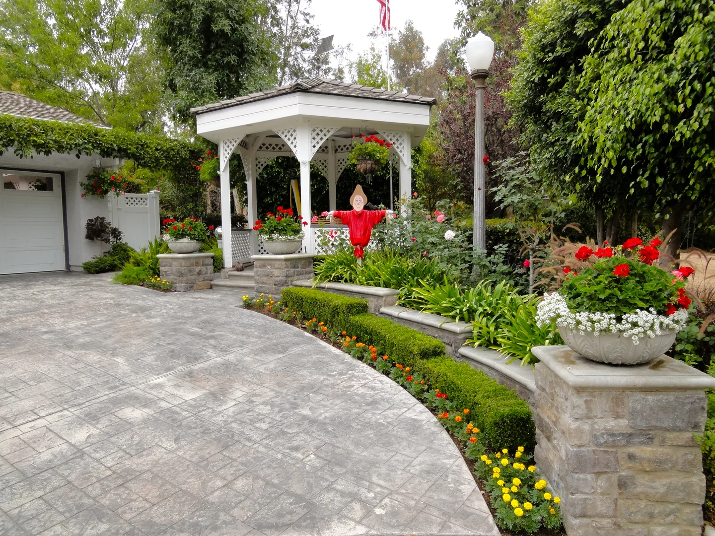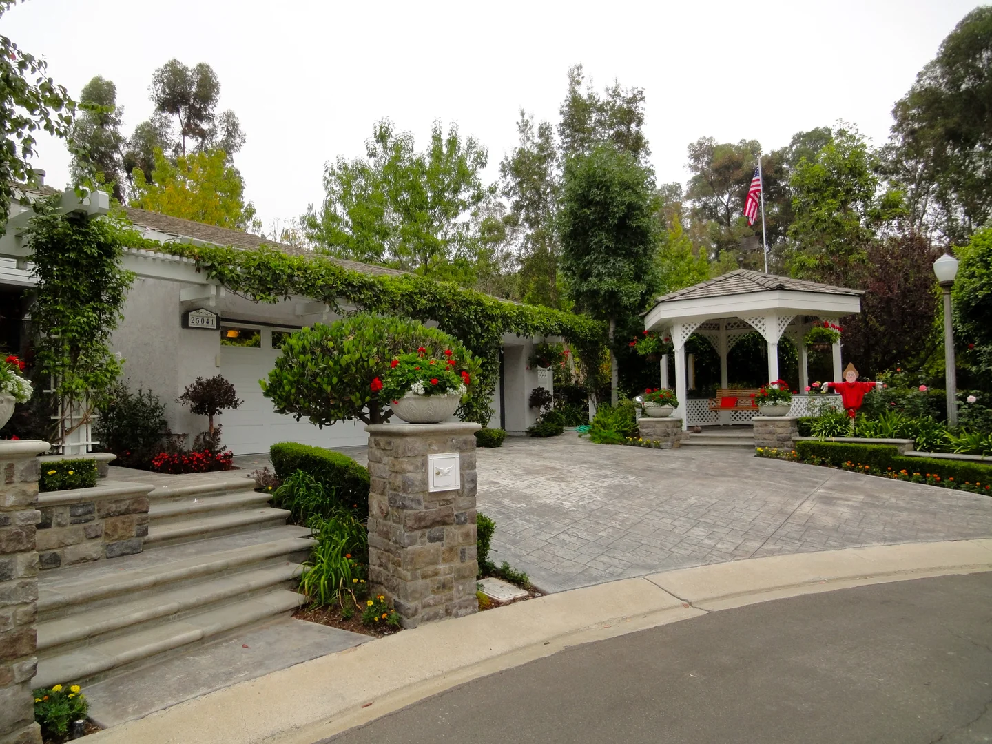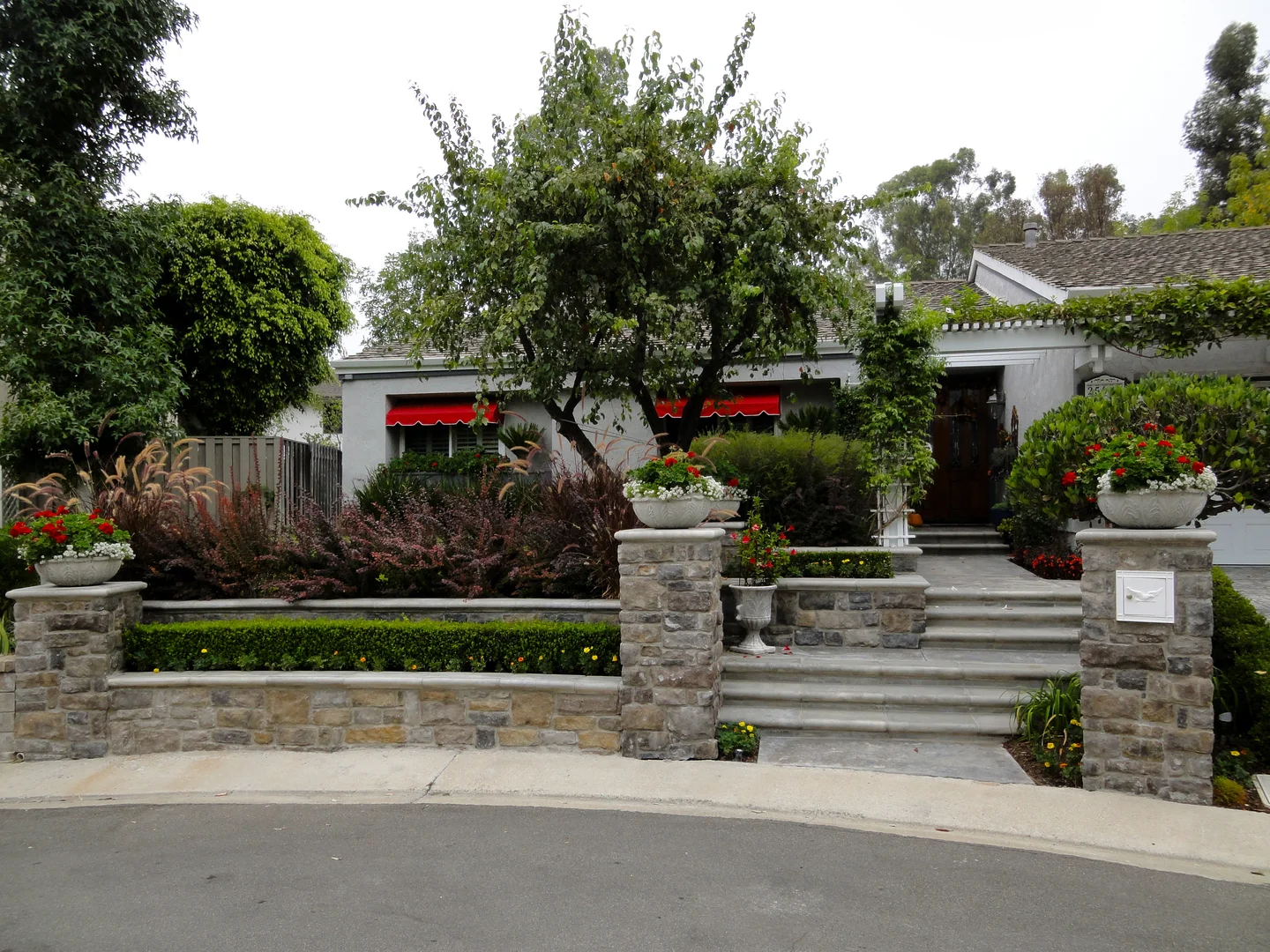 This neighborhood favorite landscape design in Lake Forest, CA incorporated terracing to address elevation changes and add visual interest. It also created a strong and interesting connection to lead visitors from the street to the front door, incorporated low garden walls and pilasters using aged stone, replaced the existing driveway to create a hardscape material uniformity, created an outdoor kitchen in a limited rear garden space, and incorporated low maintenance plant material of varied textures. The result is crisp, classic, and timeless.